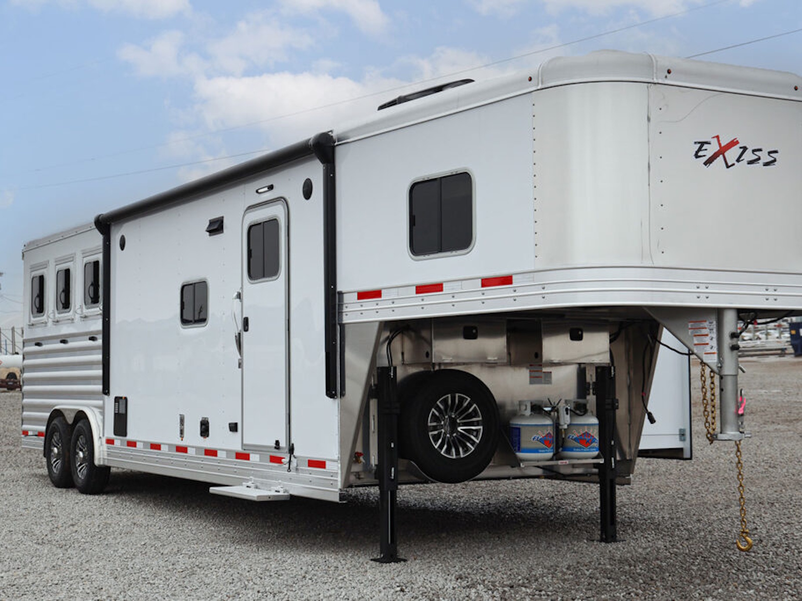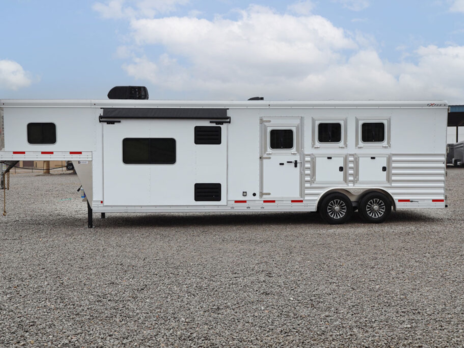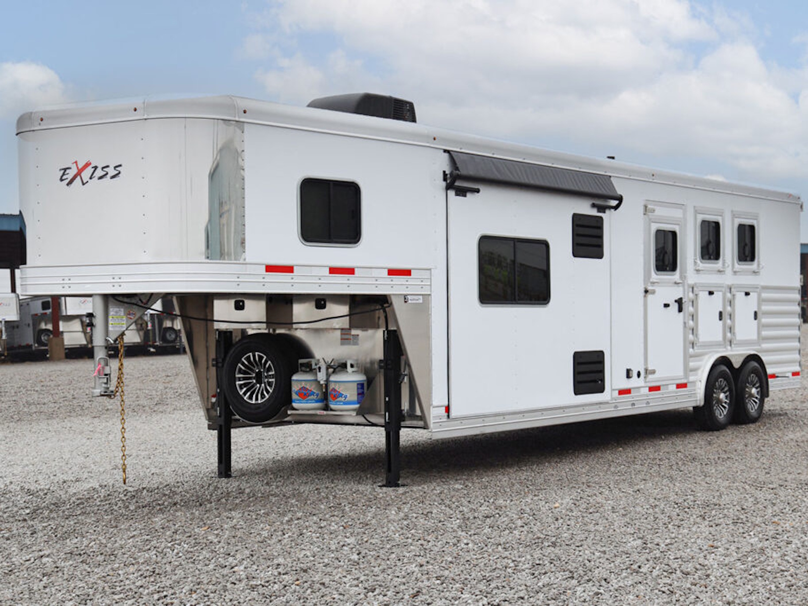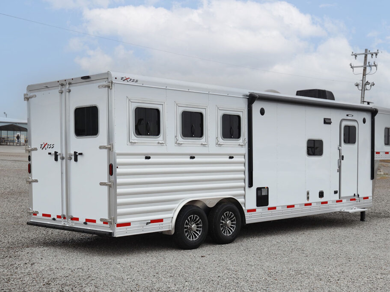 • A convenient electric awning is standard with Exiss living quarters, providing sun protection when relaxing outside your horse trailer. LED lighting is part of the awning for extra light at night.