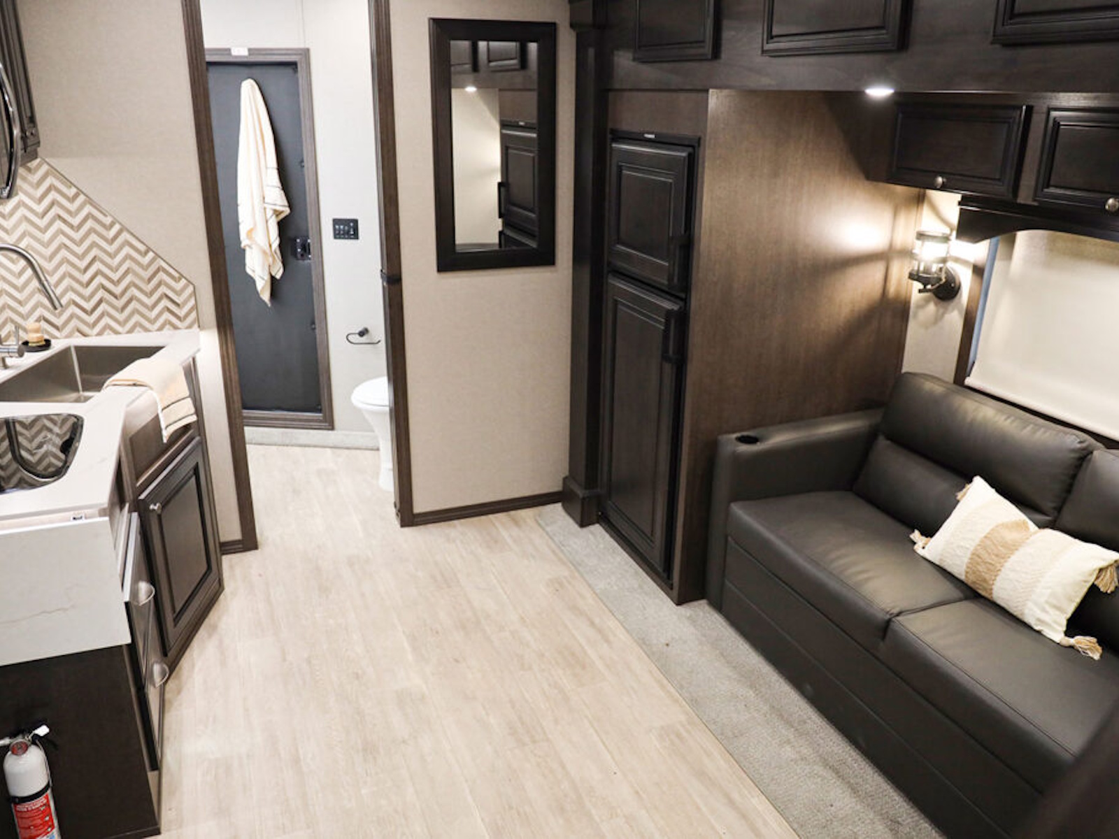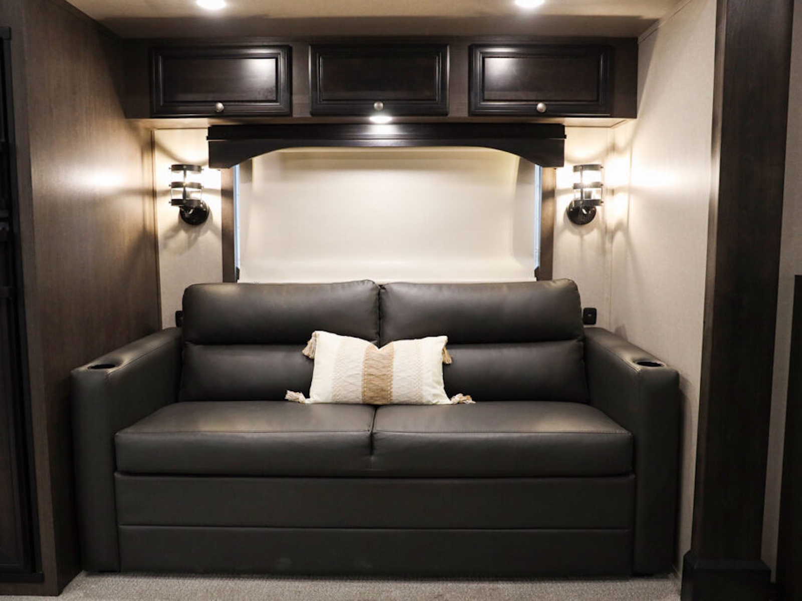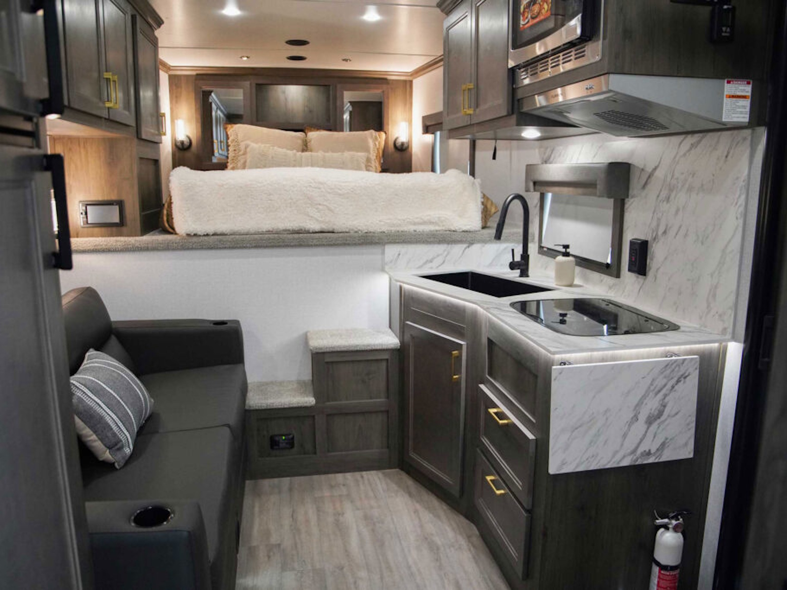 • Exiss living quarters now come with our redesigned sofas. These modern sofas feature cupholders with USB chargers behind the sofa. They easily fold down for extra sleeping space inside the interior.