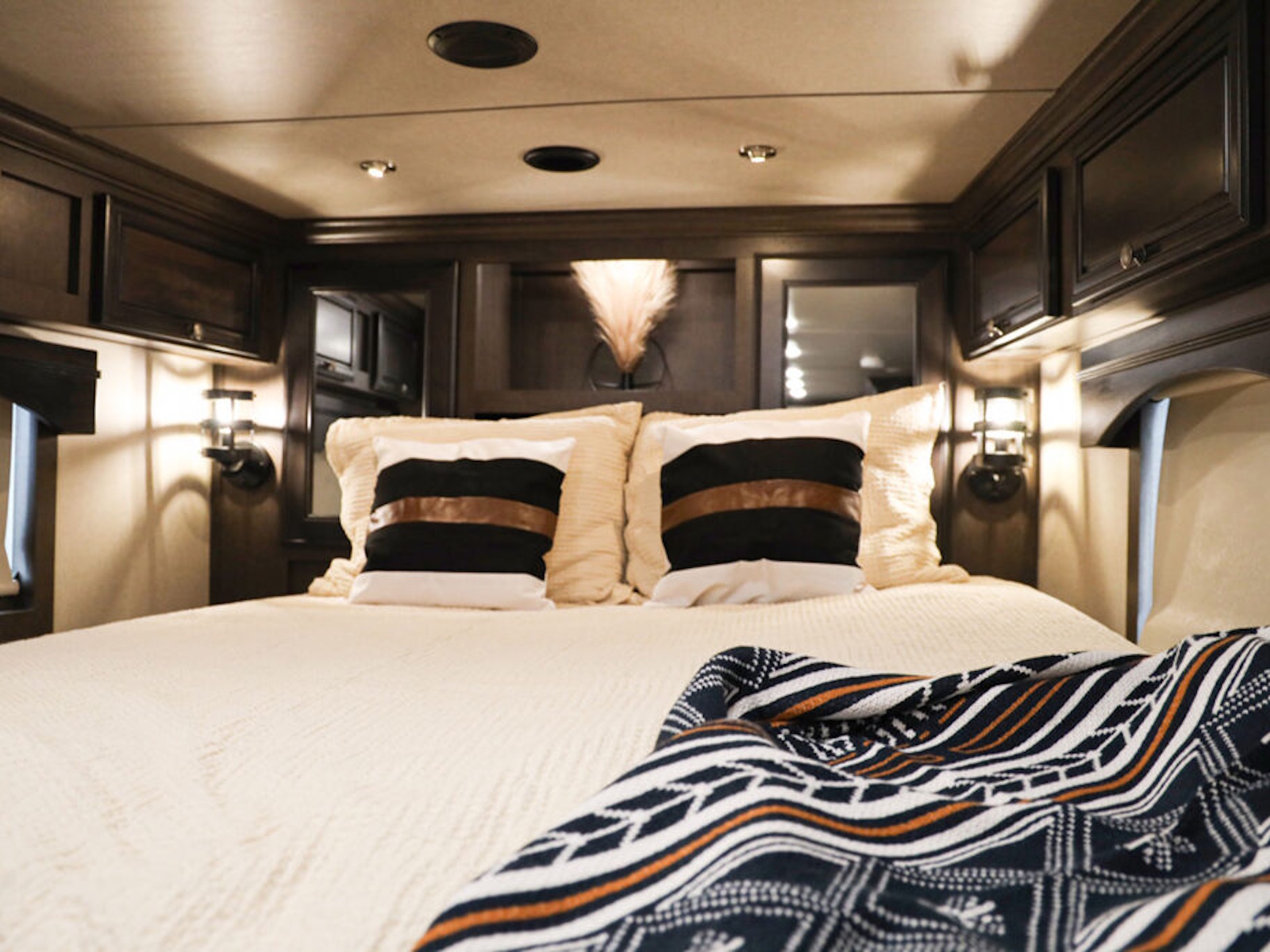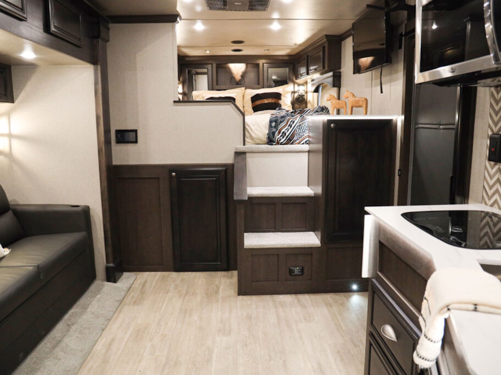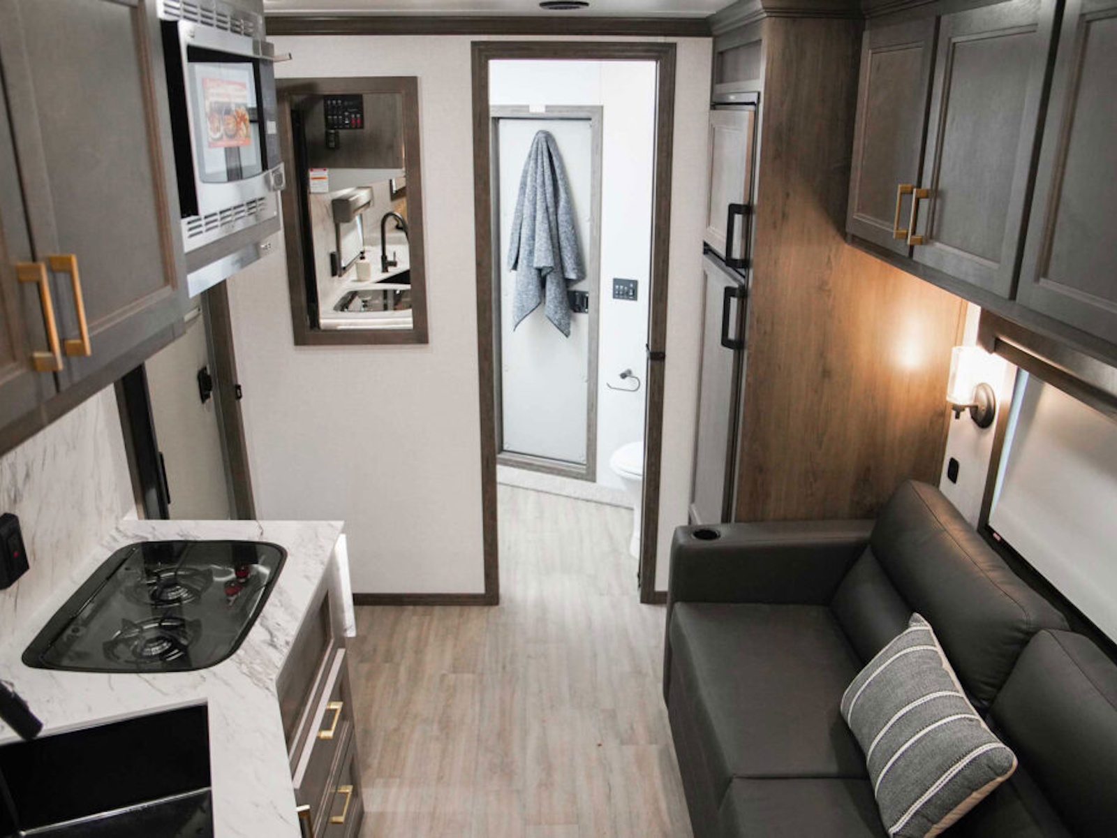 • Exiss living quarters now come with our redesigned sofas. These modern sofas feature cupholders with USB chargers behind the sofa. They easily fold down for extra sleeping space inside the interior.