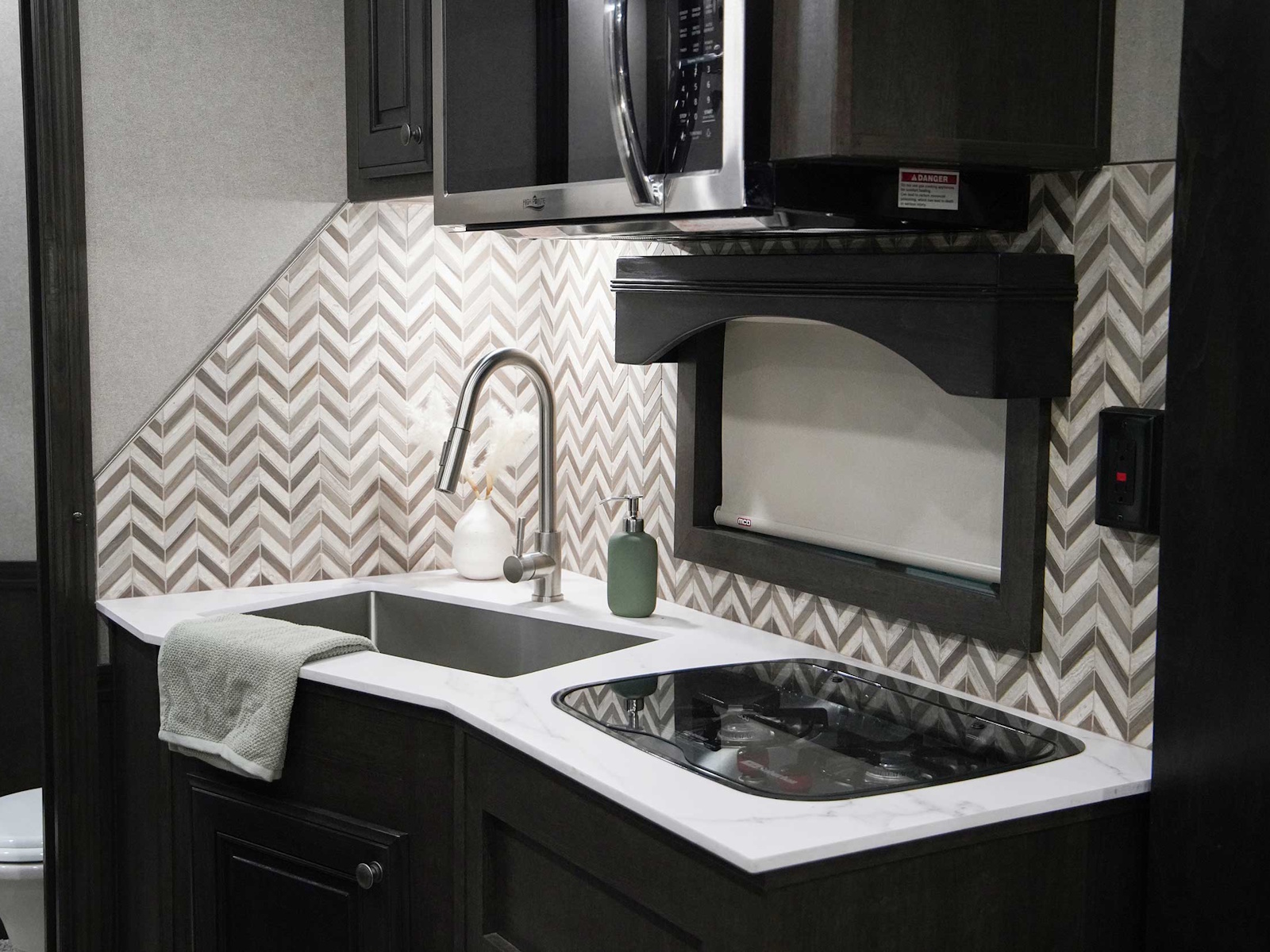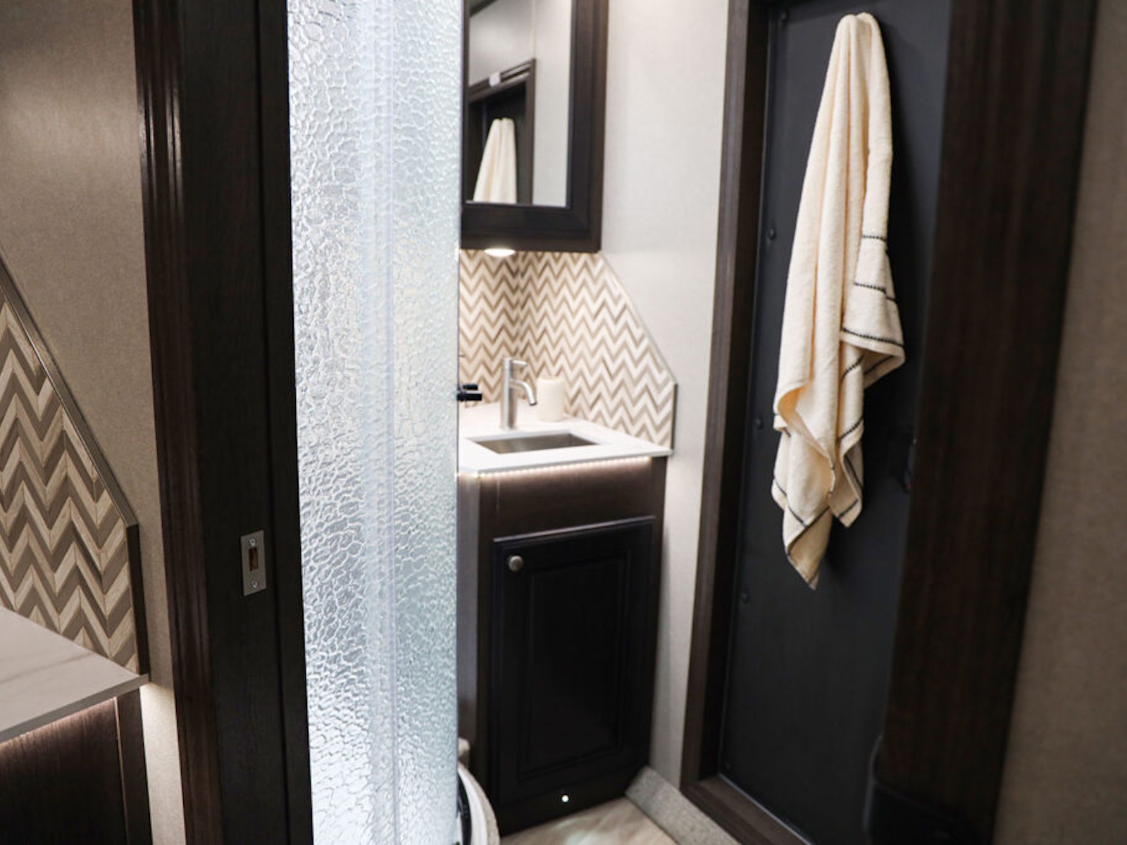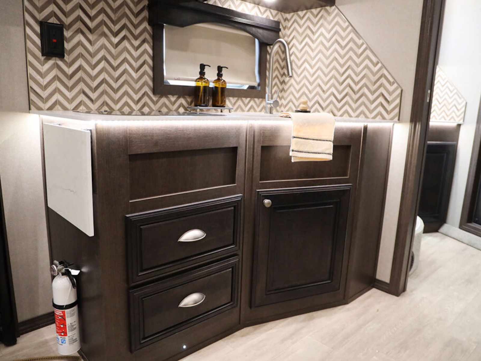 • Living quarters décor packages in Exiss living quarters trailers come standard with a stylish full height backsplash in the kitchen and bathroom.